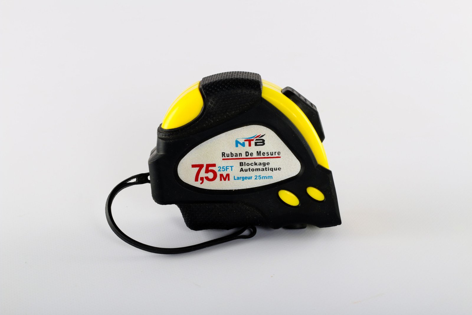 Mètre ruban 7.5m x 25mm NTB avec système de blocage automatique. Idéal pour travaux de construction, bricolage et mesures précises.